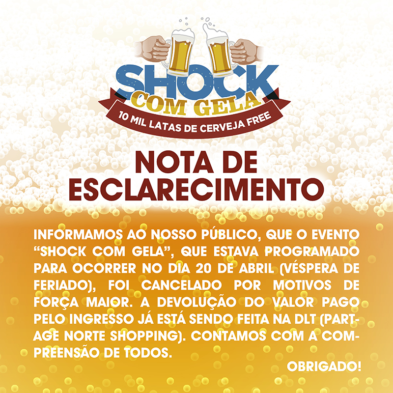 Informamos ao nosso público, que o evento #shockcomgela, que estava programado para ocorrer no dia 20 de abril (véspera de feriado), foi cancelado por motivos de força maior. A devolução do valor pago pelo ingresso já está sendo feita na DLT (Partage Norte Shopping). Contamos com a compreensão de todos